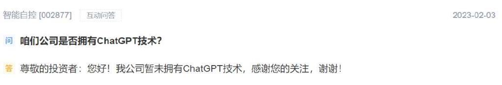 那么,火出圈的ChatGPT公司是否涉及?智能自控还比较诚实,2月3日,在深交所互动平台明确表示,公司暂未拥有ChatGPT技术。