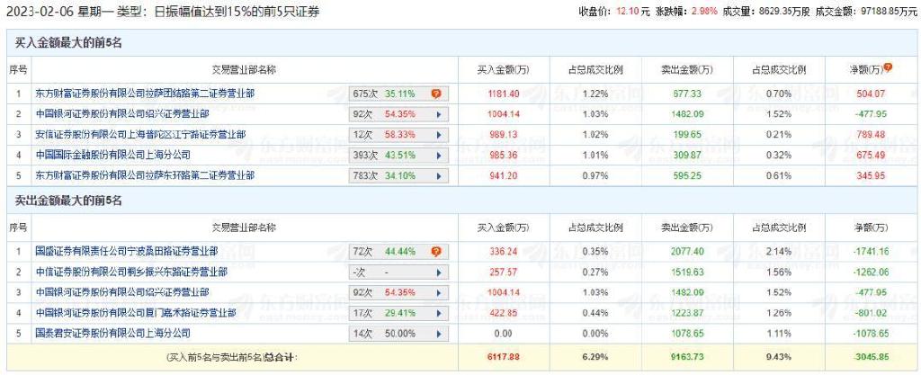 2月6日龙虎榜显示,有“拉萨藏獒天团”之称的东方财富证券拉萨东环路第一、第二营业部和东方财富证券拉萨团结路第一、第二营业部均榜上有名,其中东方财富证券拉萨团结路第二营业部和东方财富证券拉萨东环路第二营业部,分别买入1181.40万元和941.20万元,卖出677.33万元和595.25万元。