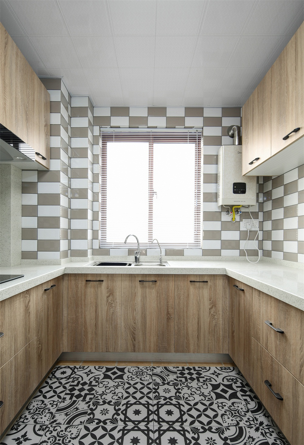 厨房木质橱柜,搭配几何地板,壁砖,色彩过渡自然。