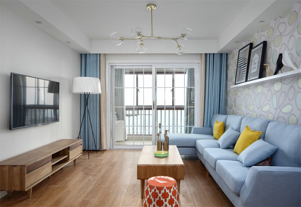 原木色地板加天蓝色沙发,客厅尽显温馨。