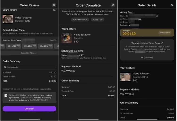 选择投放的时间段(某个时间点的15分钟内)后,进入付款环节。用户只需付出40美金的投放费用,甚至不会产生消费税。下单不久,TSX App会通知用户更具体的时间段。在投放前的几分钟,TSX App会给出倒计时提醒,以防广告主错过投放。