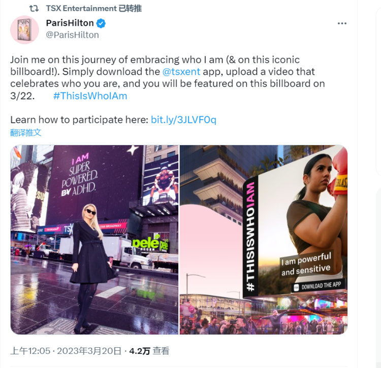 今年2月,热情的观众们聚集在时代广场,通过TSX大屏观看“美国春晚”超级碗的赛事转播。3月,帕里斯·希尔顿在TSX大屏投放视频并与之合影,为#ThisIsWhoIAm发声,同时号召大家一起登上这块大屏。