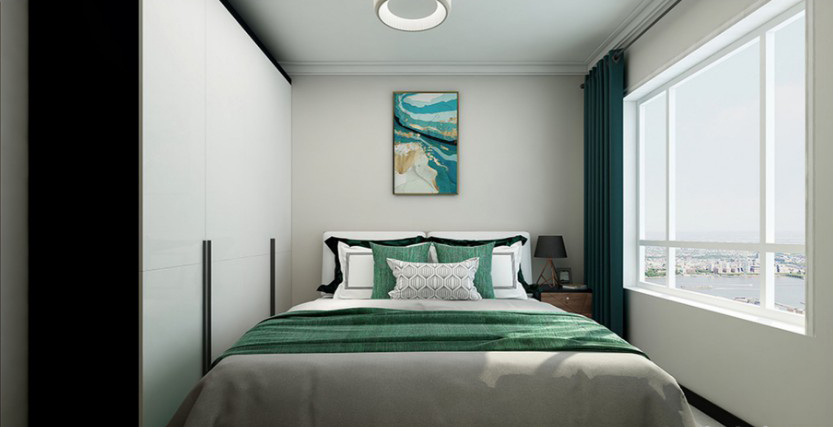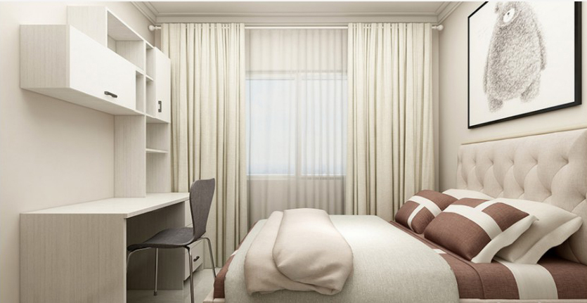 卧室采用减压的淡米色墙面和窗帘色系一致,清新的床品使空间活力倍增
