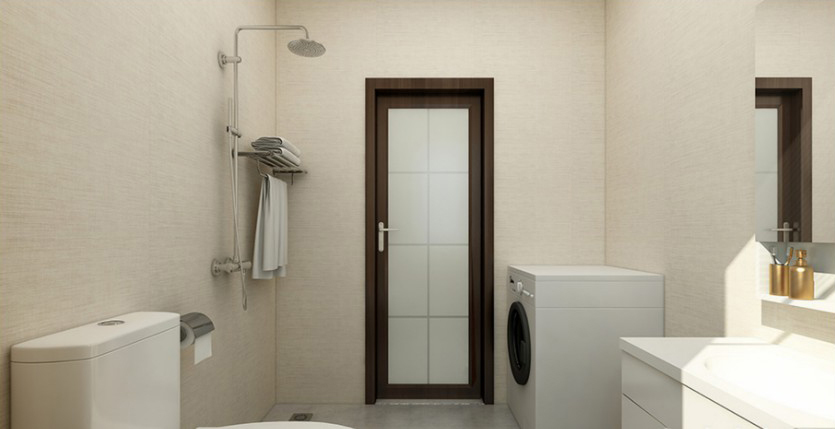 卫生间高级感十足,卫浴柜的色彩鲜亮,与整体墙地砖的冷色调鲜明对比,大气美观,干净整洁