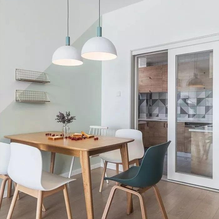 餐厅和客厅整体风格上还是保持一致,原木色与白色相搭,薄荷绿和白色相间的乳胶漆背景墙很小清新,自然舒适,轻松怡人。