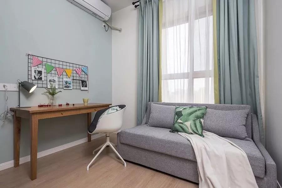 书房里一张小桌子就是阅读或者工作的地方,灰色的布艺沙发很文艺范~
