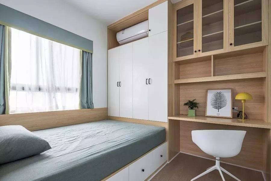 卧室的床和两个床头柜,与外面的茶几沙发一样,采用的木质,原木色与床单被套和床头背景墙形成对比,自然和谐。