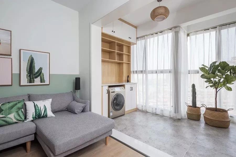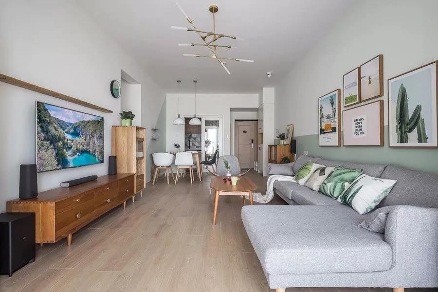 客厅的采光非常好,背景墙上是撞色系,上面是白色的,下面是薄荷绿的乳胶漆,很小清新。