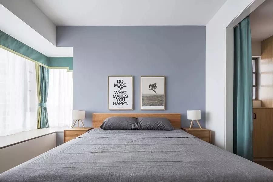 和客厅的整体风格一样,灰色和白色相搭,没有多余的装饰,色系比较统一,很干净安逸,随性的感觉。床的旁边是一个衣帽间,用蓝色的帘子做的隔断,很实用。