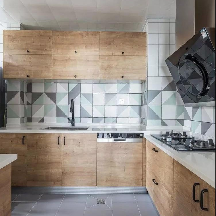 厨房是半包围型的,灰色哑光地板砖很低调,但是看上去很有质感,墙面的小花砖很耐脏,因为厨房本身就是一个油烟很重的地方,容易弄脏。
