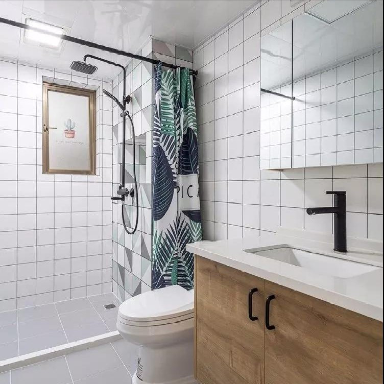 卫生间的隔断没有采用透明的玻璃,采用的一张绿叶图案的帘子遮住的。