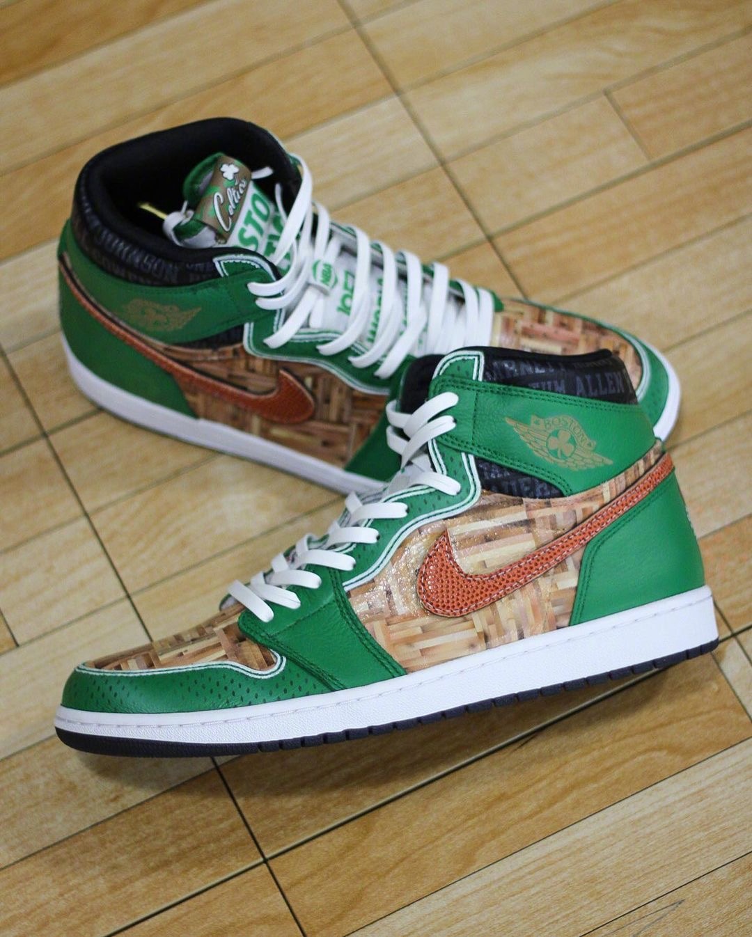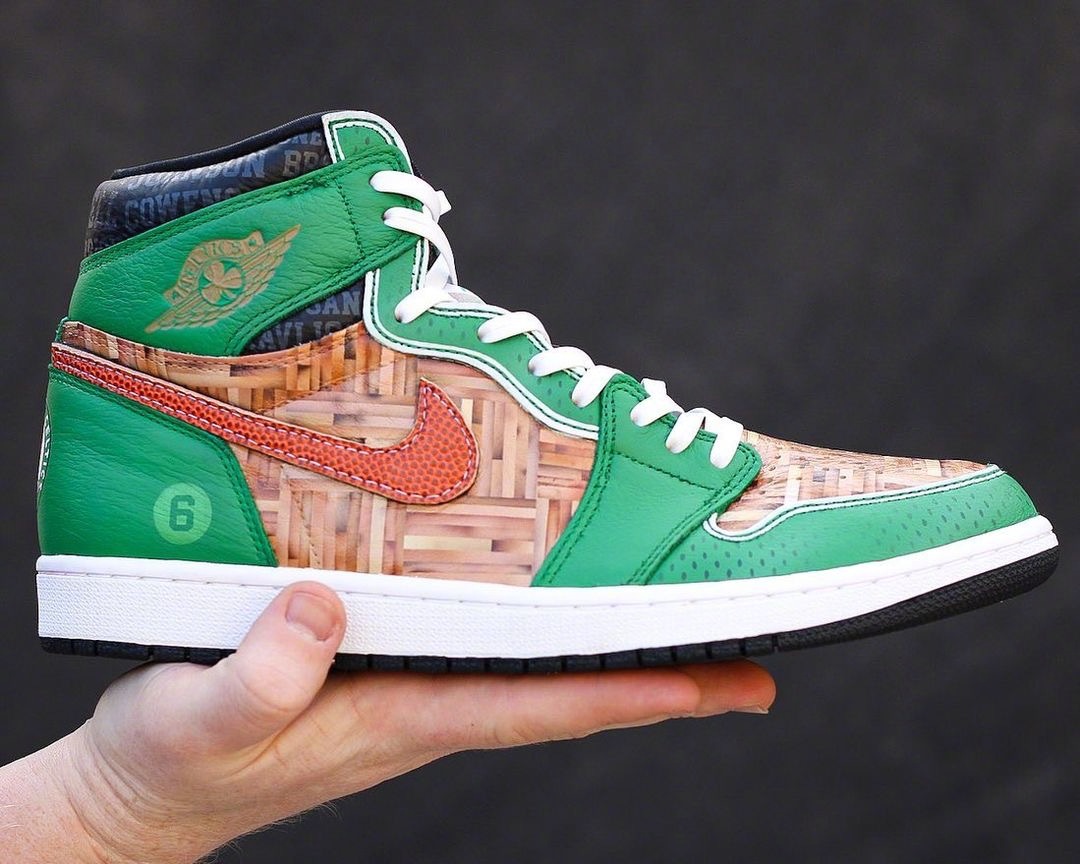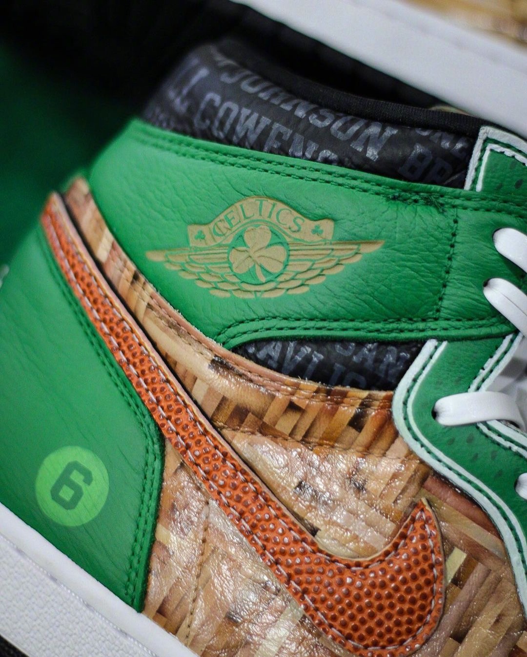 提到关于波士顿凯尔特人的特色,TD花园的橡木地板属联盟独一档。比尔·拉塞尔(6)统治的三秒区、队史功臣的姓氏、篮球皮纹Swoosh、复古球衣网眼与螺纹元素,都在这双Air Jordan 1鞋身上得以体现。