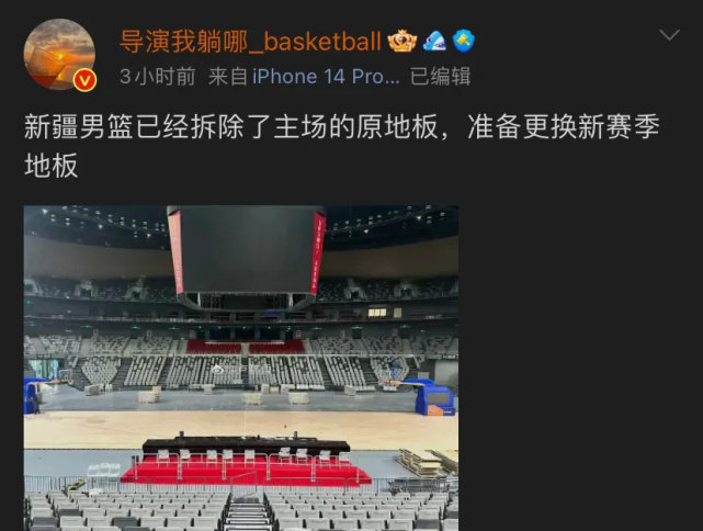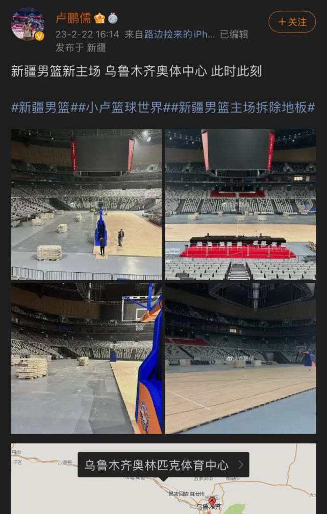 北京时间2月22日,媒体人卢鹏儒更新动态,晒出了多张新疆男篮主场拆地板的图片,并且在配文中写道:“新疆男篮新主场,乌鲁木齐奥体中心,此时此刻。”