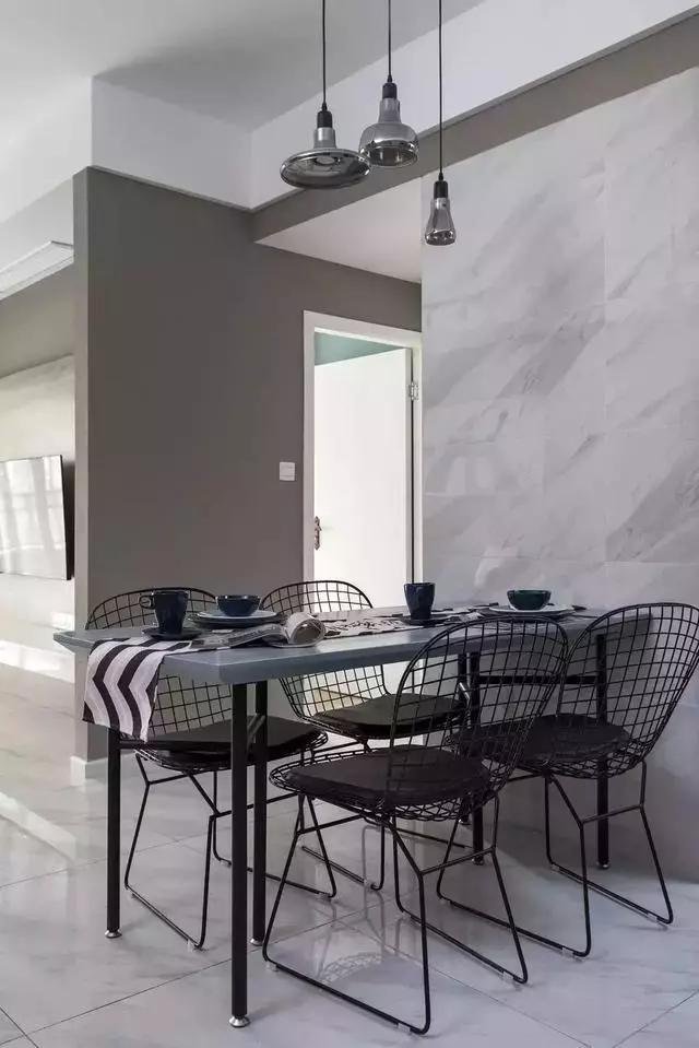 餐厅的墙面铺贴了和地面一样的大理石瓷砖,结合黑色的铁艺餐桌椅,黑与白的搭配,让人感觉很有现代时尚感。