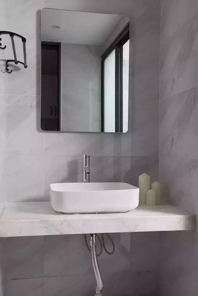 卫生间内部通铺大理石瓷砖,白色带有灰色花纹的瓷砖结合简约款的洗手台,让卫生间给人一种干净利落的感觉,宽敞而又明亮。