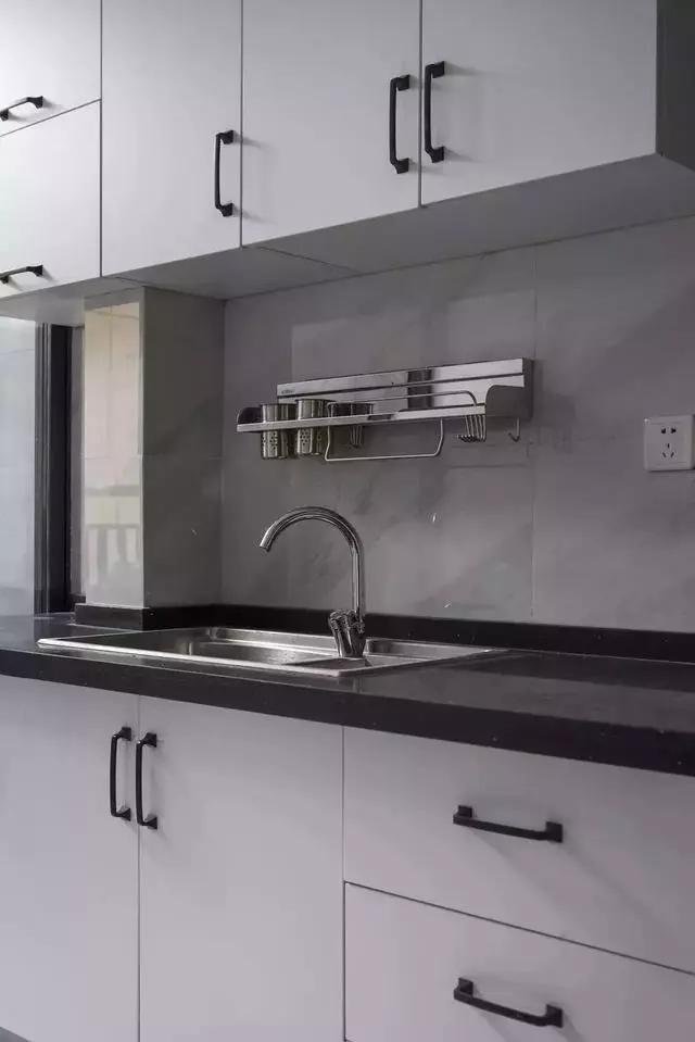 厨房内部的设计比较简单,白色的橱柜搭配大理石墙砖,黑白灰的经典搭配,让厨房显得简洁而又大方。