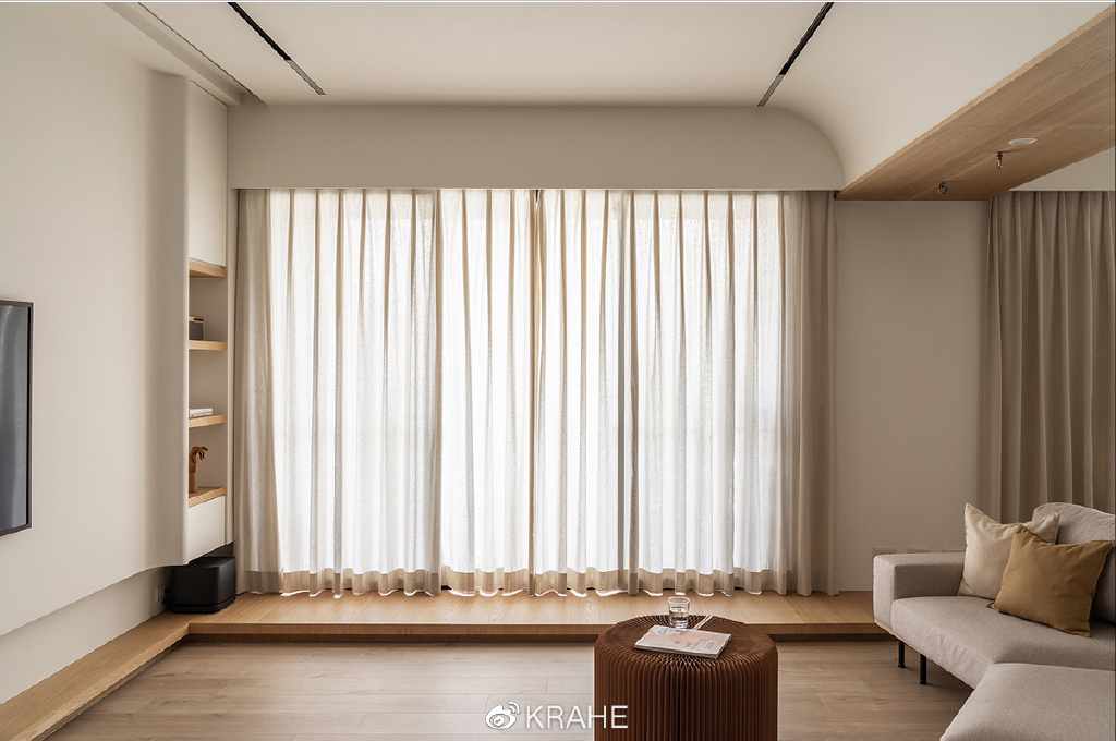 以圆弧棱线收起转角,在小面积住宅中,将视线从玄关引入客厅,避免了拥挤的感觉,上方格栅元素与天花连接,落至圆弧边时,格栅更一展细致之美。