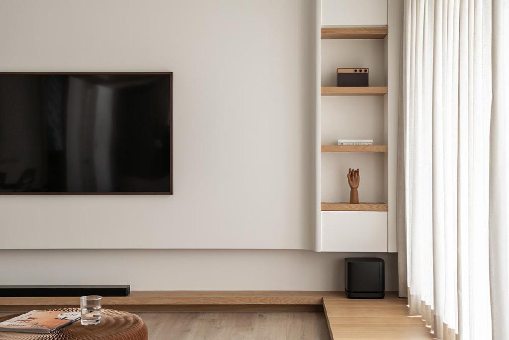 正如之前所说,小户型住宅的面积是最宝贵的,客厅设计务必要保证空间充裕。本案仅以白色涂料覆面,两侧以浅弧收边,修饰了天花板线条,弱化生硬直角,同时翻折至主墙立面。