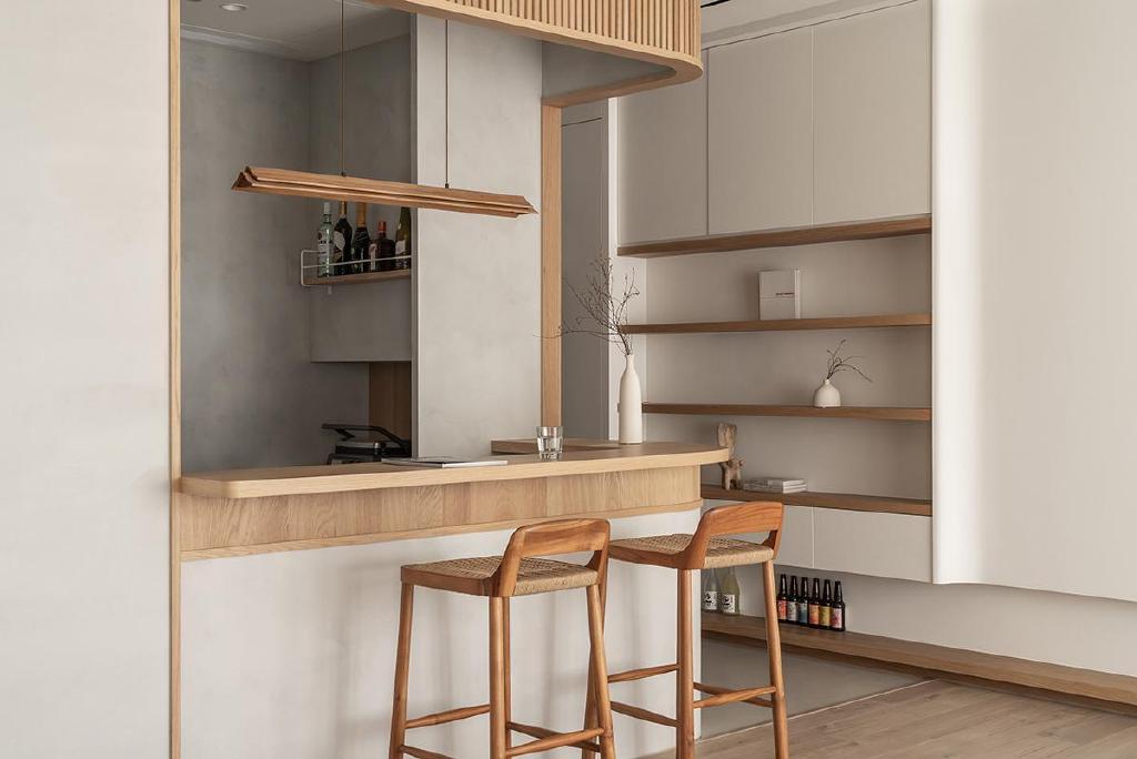 原本厨房是开放式的,家中原先的餐厅位置改为茶室,因此将厨房半封闭,保留岛台的同时,延伸出吧台、高脚椅,满足日常就餐需求。