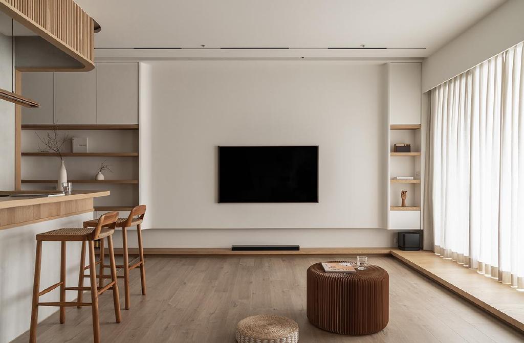 电视柜加入少量木质元素,虽然大面积留白,但洁净清爽、自在放松。大梁下的沙发、简易坐垫和茶几。