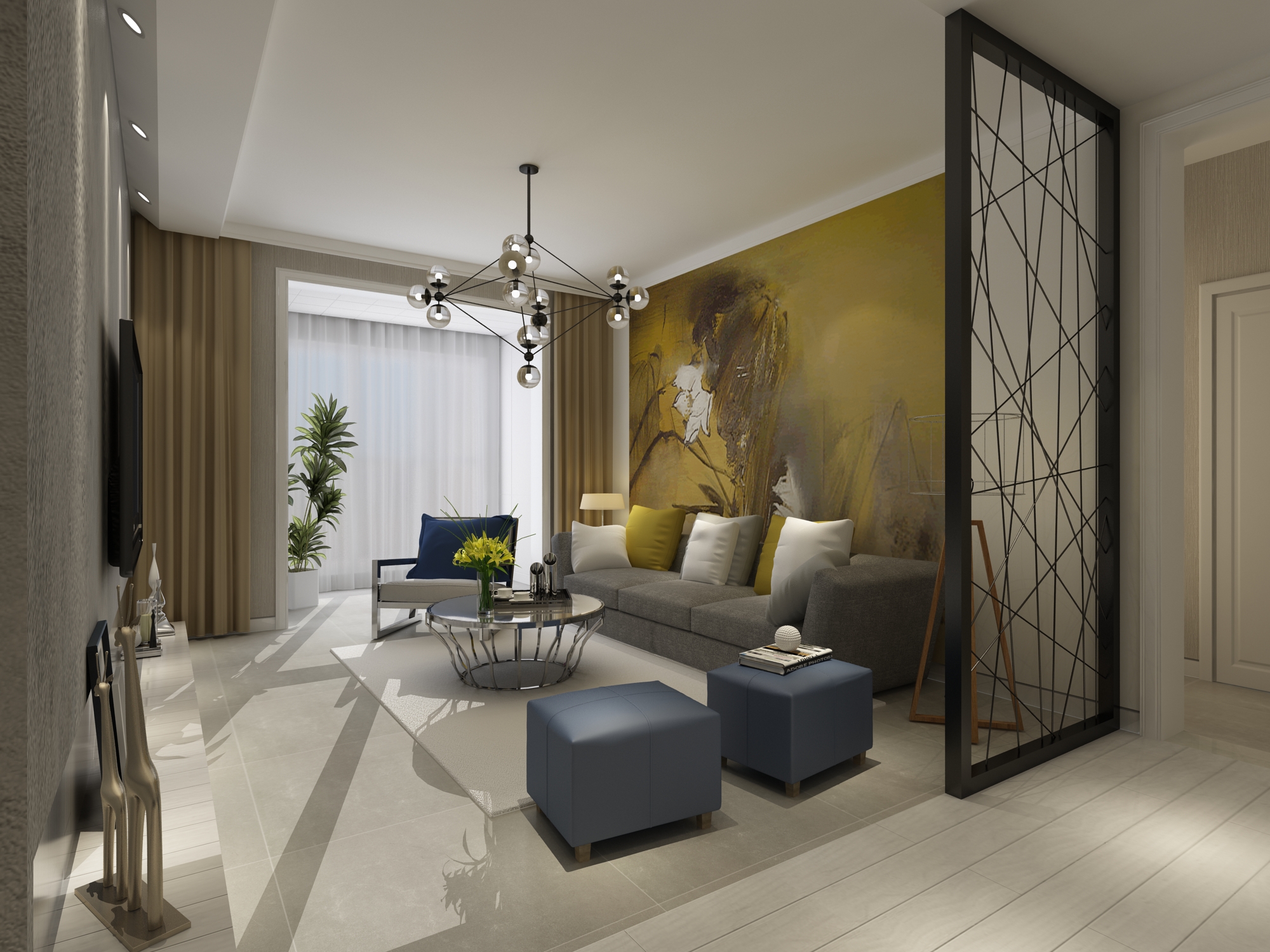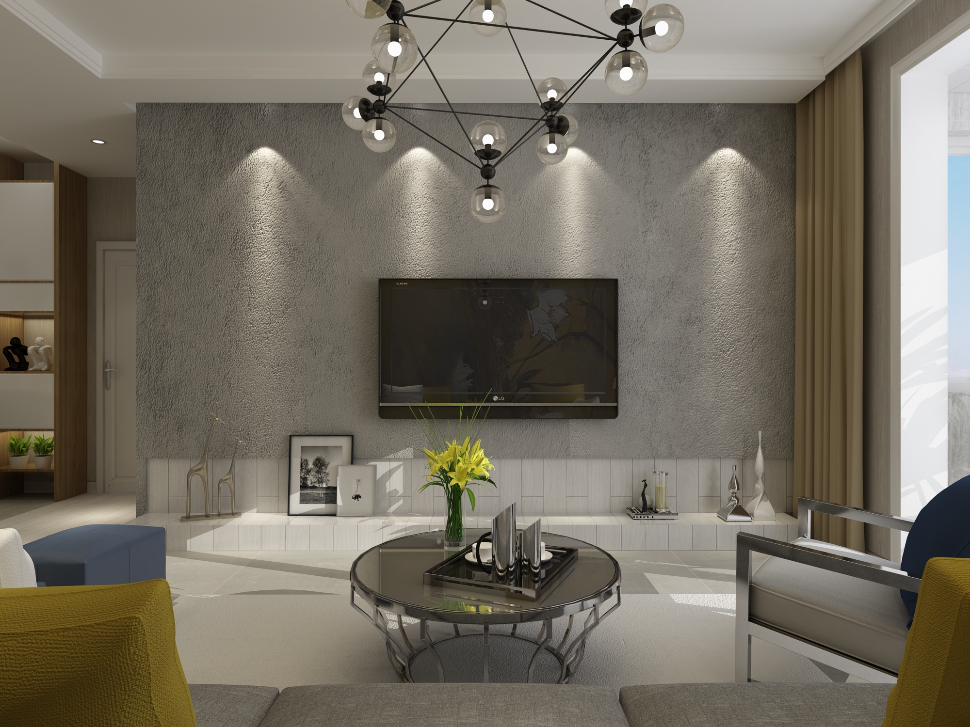客厅:干净的电视背景,配上木地板地台;沙发墙简洁大方,符合客户的喜好要求。