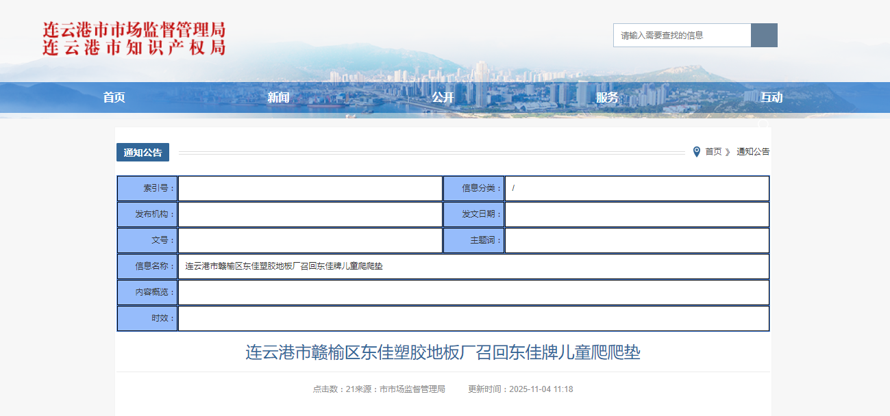 中国质量新闻网讯 据连云港市市场监管局消息,日前,连云港市赣榆区东佳塑胶地板厂按照《消费品召回管理暂行规定》《江苏省缺陷消费品召回管理办法》的要求,主动向连云港市市场监督管理局报告了召回计划,将自即日起,召回2022年6月1号到2022年11月27日制造的规格型号为60*60*1.2东佳牌儿童爬爬垫,涉及数量为10600件。